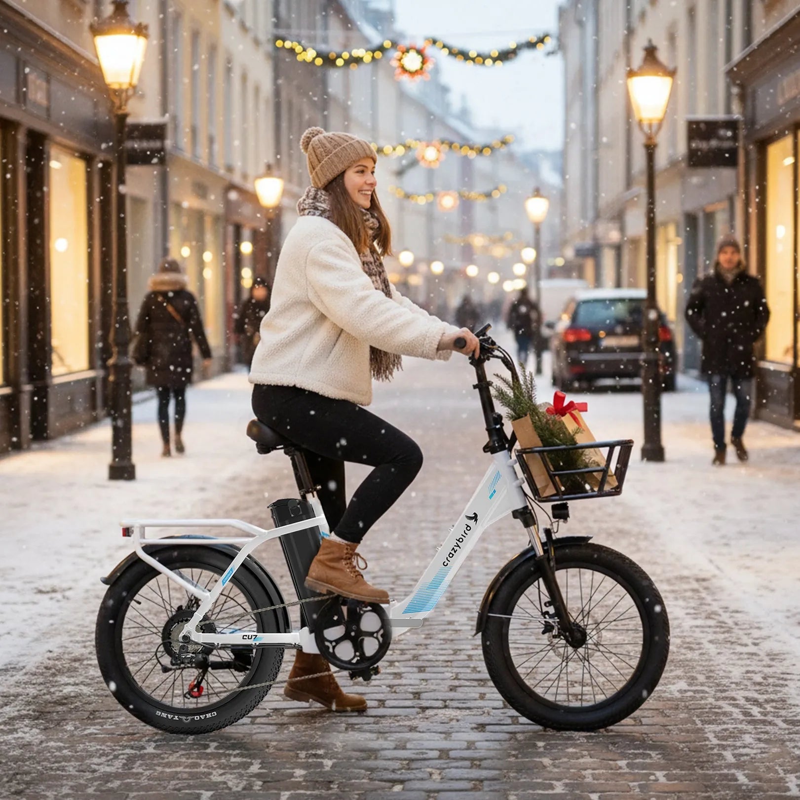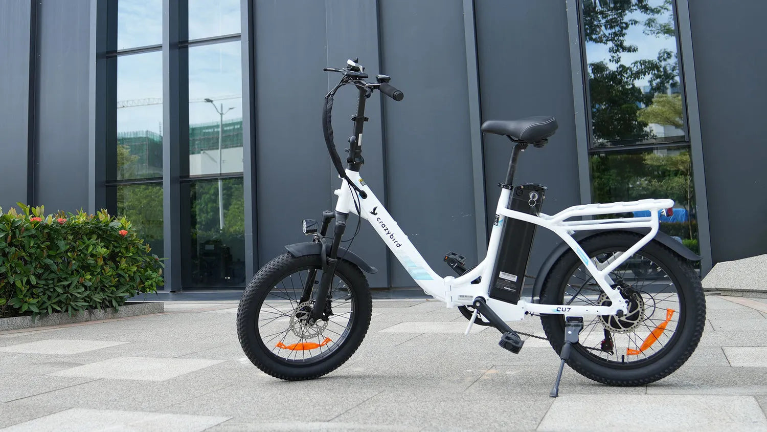 The CU7 has features designed for urban commuting, including integrated lights for visibility and fenders for splash protection, as well as 20" x 3" tires for multi-terrain riding. The wider tires provide better grip and cushioning for enhanced comfort while riding.